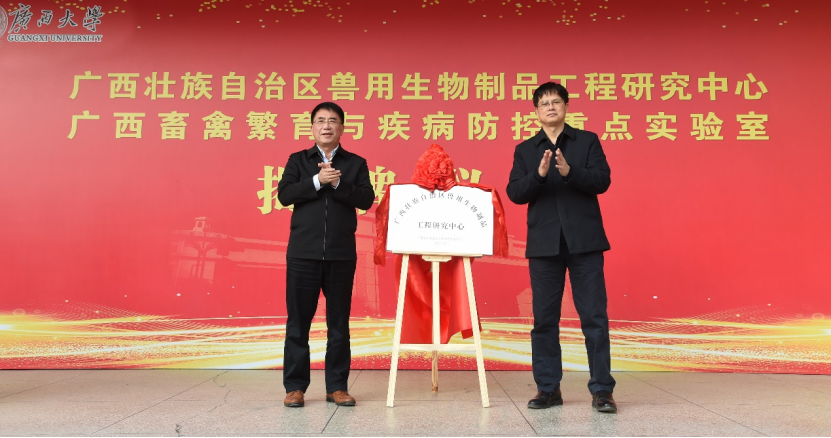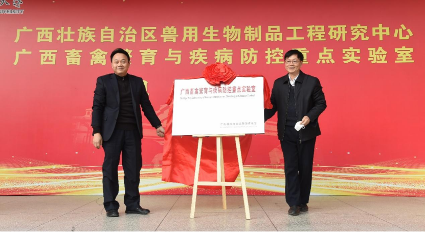 广西农业农村厅二级巡视员黄庭军和石德顺教授为广西畜禽繁育与疾病防控重点实验室揭牌