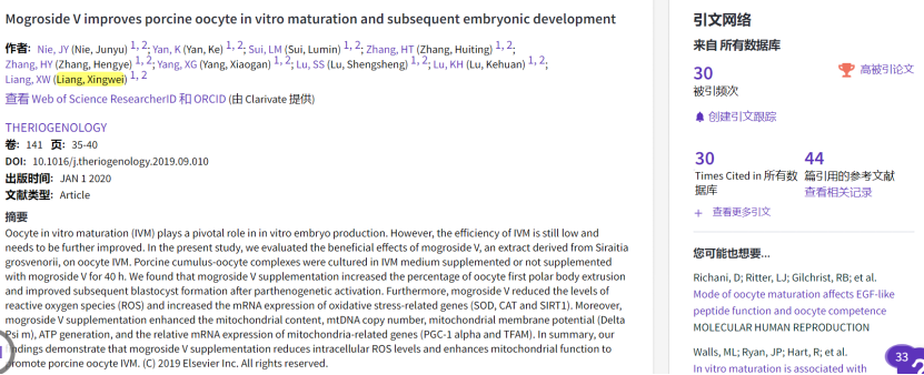 Nie J., Yan K., Sui L., Zhang H., Zhang H., Yang X., Lu S., Lu K., Liang X.: Mogroside V improves porcine oocyte in vitro maturation and subsequent embryonic development. Theriogenology 2020;141:35-40 (入选ESI高被引论文)
