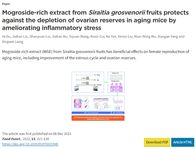 Du Y, Liu J, Liu S, Hu J, Wang S, Cui K, Yan K, Liu X, Wu N-R, Yang X, and Liang X. Mogroside-rich extract from Siraitia grosvenorii fruits protects against the depletion of ovarian reserves in aging mice by ameliorating inflammatory stress. Food and Function 2022;9:121-130.