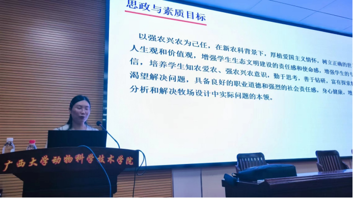 黄艳娜教授以其《家畜环境卫生与牧场设计》课程思政建设为例,分享了如何巧妙地将思政案例融入教学中。她强调,思政案例应紧密结合广西畜牧业的高质量、绿色发展战略,确保具有鲜明的地方特色,以此培育员工的农业情怀,提高员工对本专业的自信与自豪。
