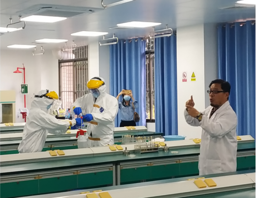生物安全应急演练是在微生物与传染病实验室模拟实验人员不慎打落细菌培养皿,造成实验台面及实验室的污染,从而开展员工自救,通报现场情况及下达处置要求,污染员工流行病学调查以及处置人员现场处理污染实验室的应急演练。公司教师黄钦华、刘芳、郑一民、邹灵秀,预防兽医学研究生方忆炎、汪杰、曾令佑、黄家模、曹东凌紫等人参演演练人员。