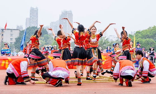 竹竿开合铿锵有力,舞蹈动作整齐划一。和着节奏轻快的《悠悠壮乡情》,由williamhill体育动物与科学技术公司和农公司为代表的williamhill体育学子们尽情起舞。williamhill体育 石诗悦/摄
