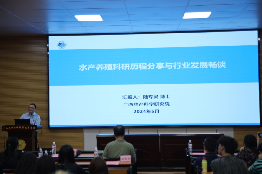 首先,水产学科负责人潘英教授为大家介绍水产学科发展、团队力量、教学条件和人才培养等基本情况,水产养殖方向的具体计划和培养方案,阐述水产养殖方向的职业发展优势。随后,广西水产科学研究院陆专灵副研究员分享其一路走来在水产行业取得的成果,并对水产未来的发展趋势做了详细的分析,为同学们构建了一个清晰的水产地图。紧接着,南宁海大生物科技有限公司水产线总经理黄东为大家解析水产行业的新发展以及大前景,最后还寄语给同学们,希望大家能学好水产,坚持传承下去。接下来,22级动物科学专业水产养殖方向班班长颜畅同学介绍了22级的分流情况,同时也向大家分享自己在水产方面的科研体验和自我提升感想。随后,渔业发展221班的在读研究生李昱达同学介绍了自己在水产学习方面精彩丰富的学习和生活经历,并热切欢迎小可爱们加入水产大家庭。