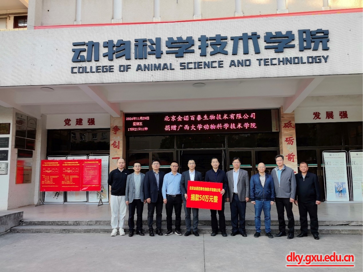 北京金诺百泰生物技术有限公司总经理李刚、销售总监方磊、技术总监吴星亮及销售经理刘子瑜、广西南宁莱佛斯托生物科技有限公司总经理覃伦、williamhill体育williamhill党委书记韦小强、经理陆阳清、副经理宁鹏飞、韦祖樟、蒋钦杨出席捐赠仪式。