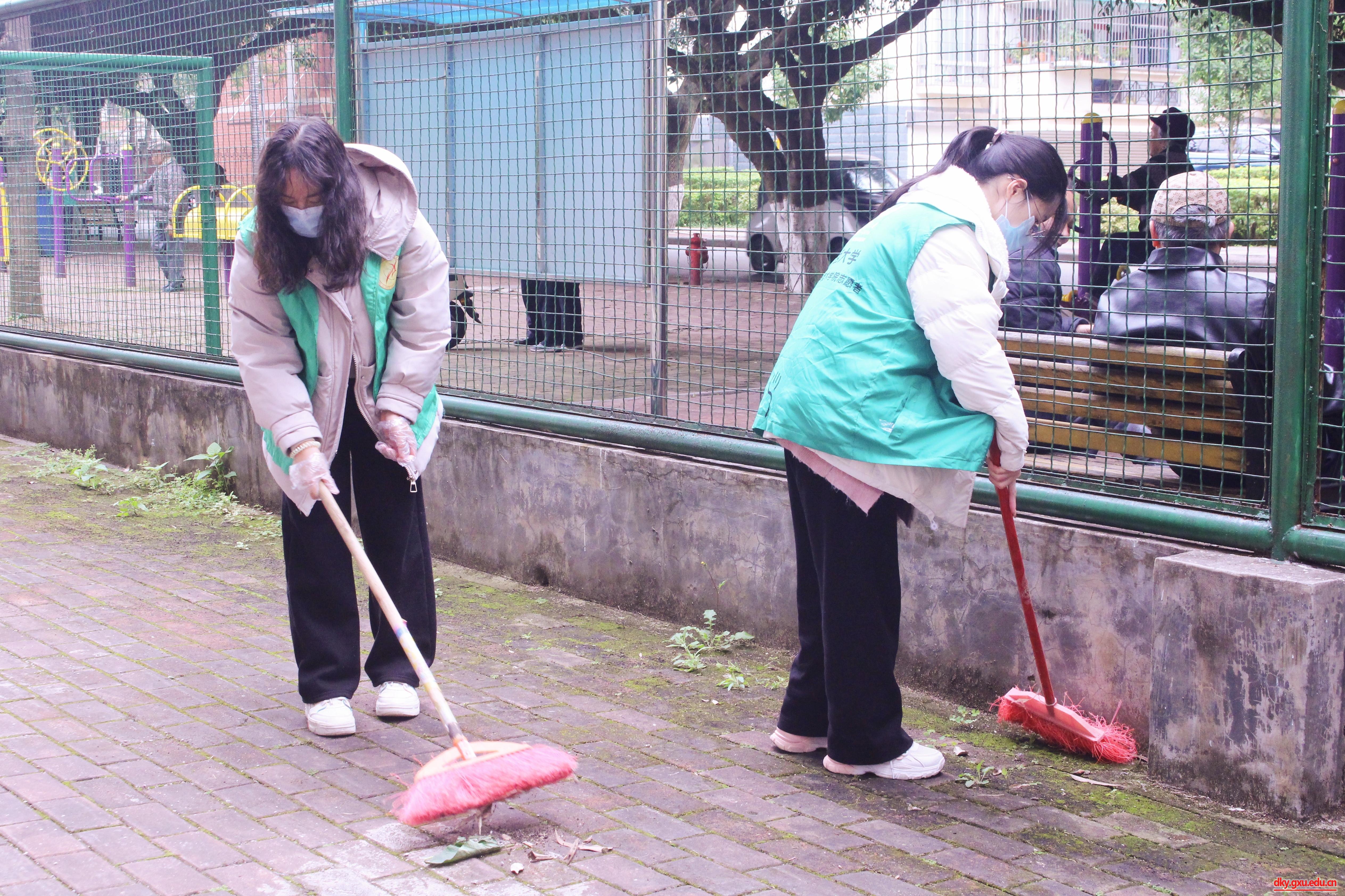 志愿者们身穿绿色马甲,拿着抹布、扫帚、铲子等工具,分工协作,相互配合,对活动中心内的垃圾、杂草等进行清理。经过两个小时的辛勤劳动,球场焕然一新。