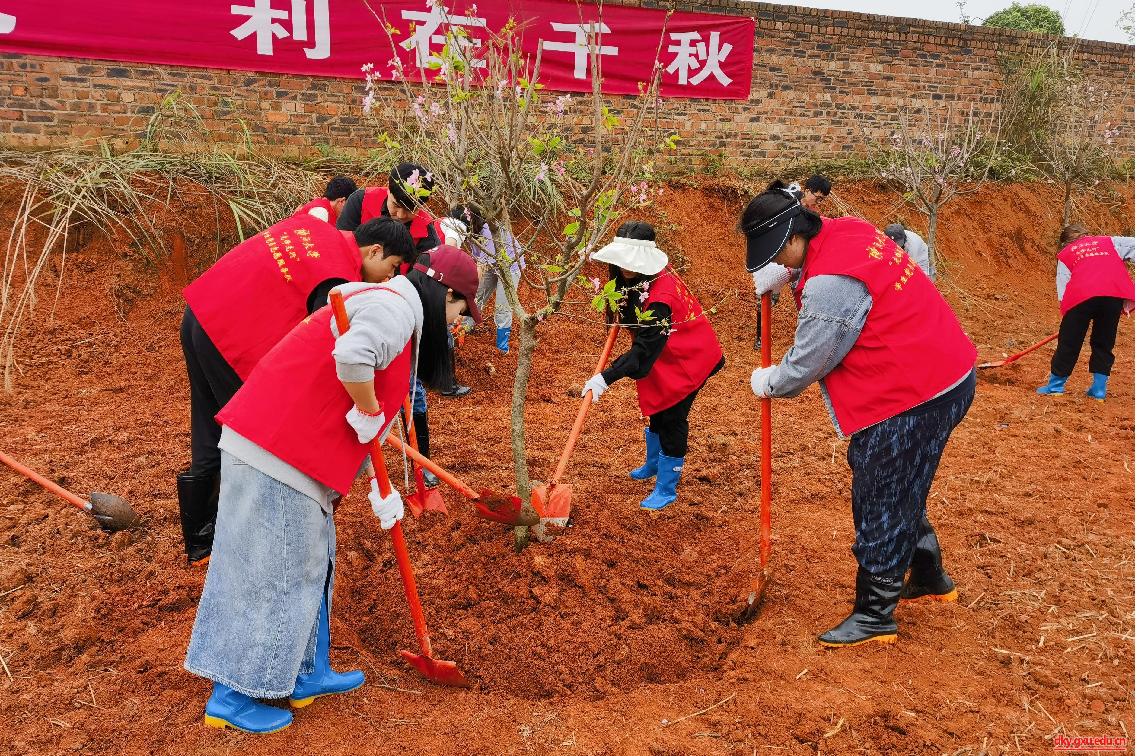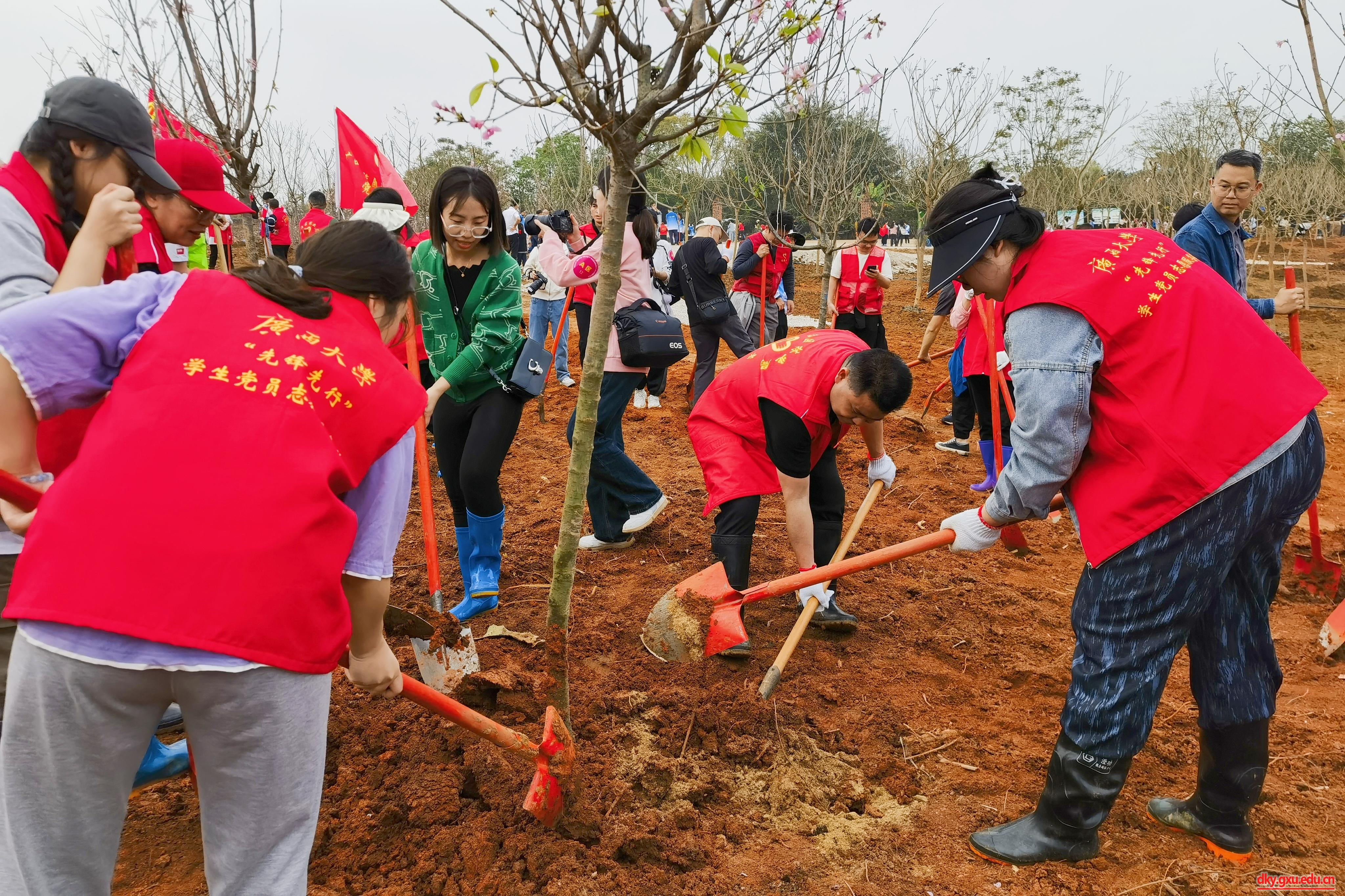 活动现场,600余名青年代表在技术人员指导下,扶树正苗、挥锹铲土、培土围堰、提水浇灌,认真细致完成每道植树工序,齐心协力种下黄花风铃木、紫花风铃木、樱花树等花卉苗木1300多株,为美丽广西再添斑斓色彩。