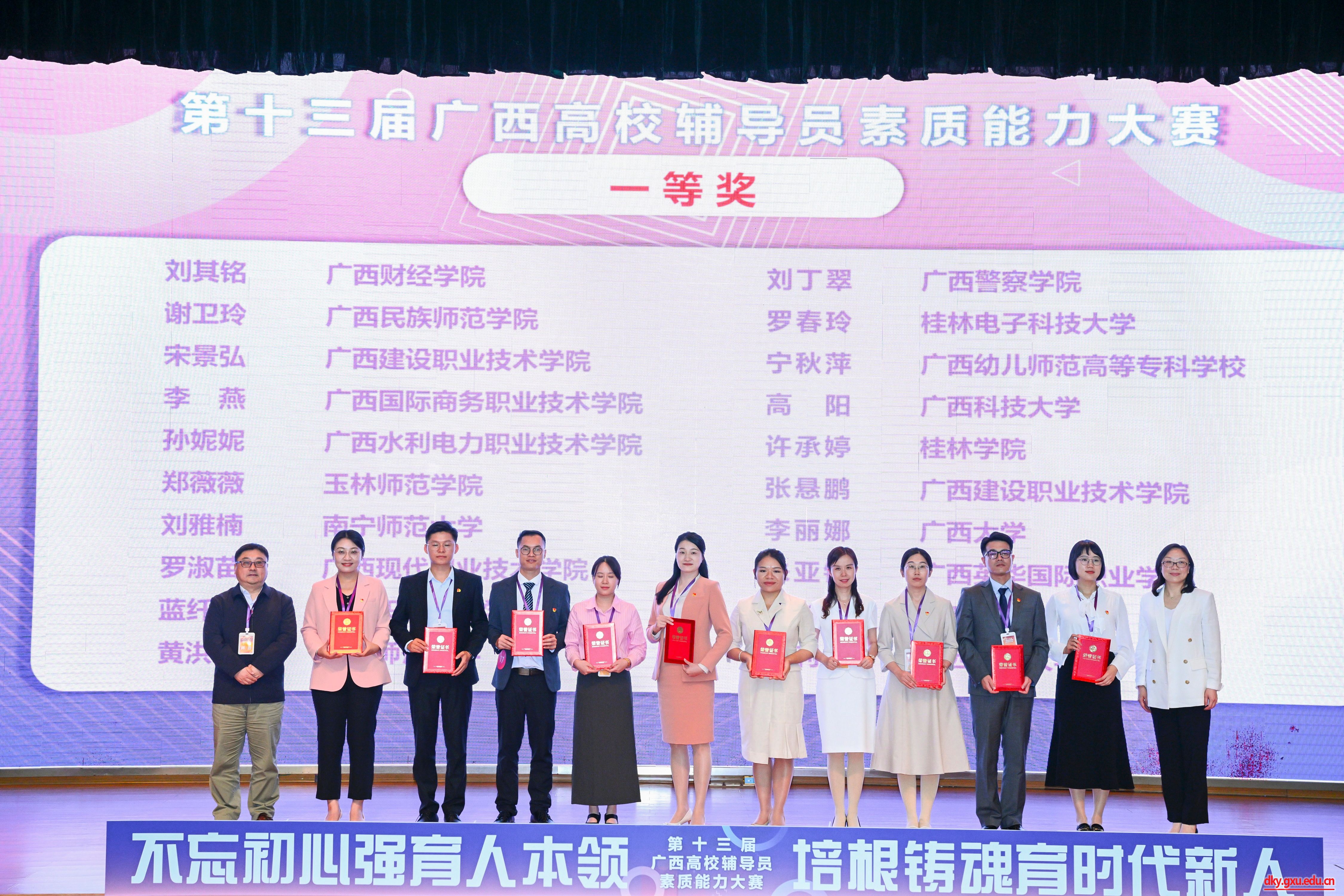 4月17至20日,由自治区教育厅主办,教育部高校思想政治工作队伍培训研修中心(广西师范大学)承办的第十三届广西高校辅导员素质能力大赛在广西师范大学举办,共有来自全区各高校的110名专职辅导员参赛。经过三天的激烈角逐,公司辅导员李丽娜老师荣获大赛一等奖。
