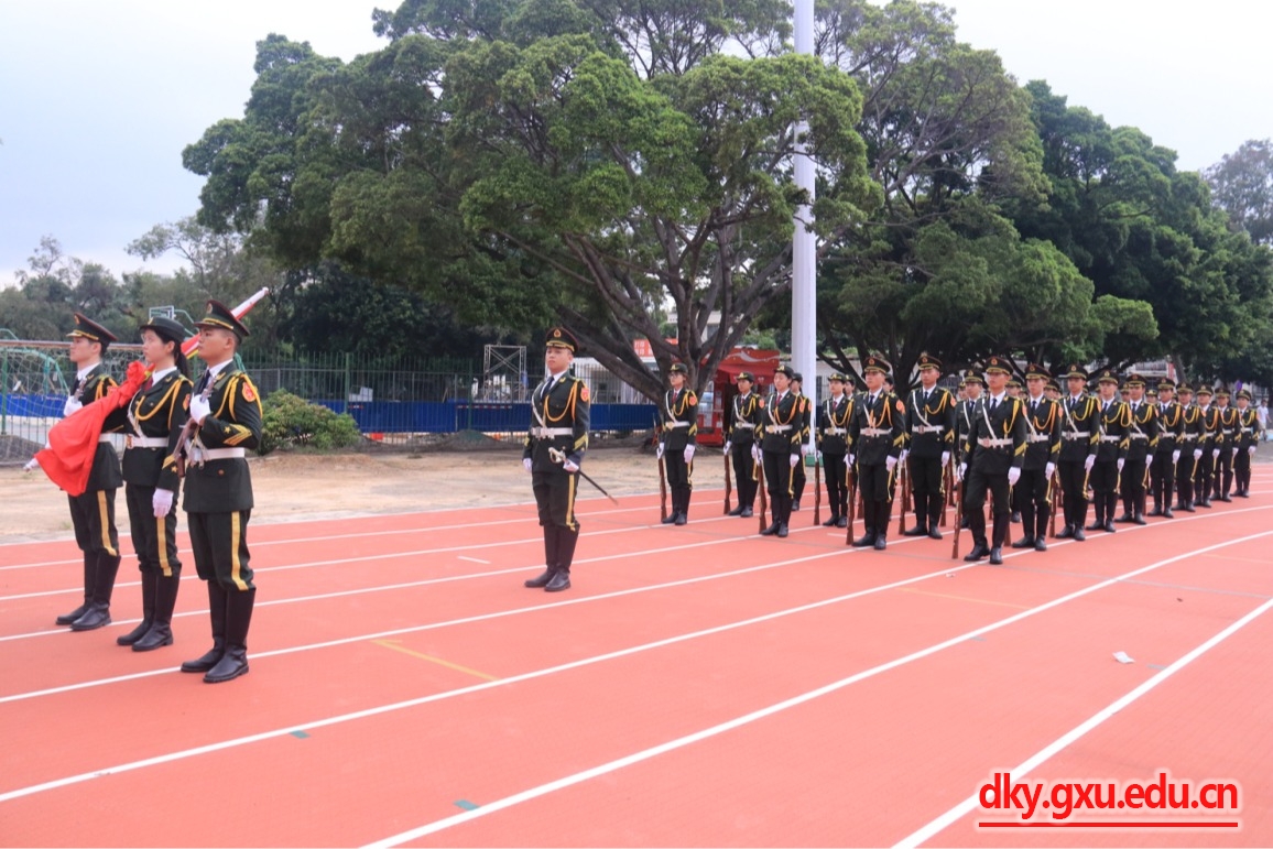 在全场师生的注目下,英姿飒爽的国旗护卫队队员,迈着整齐划一、铿锵有力的步伐,护送鲜艳的五星红旗进场。“起来,不愿做奴隶的人们,把我们的血肉筑成我们新的长城……”全场师生齐声高唱国歌,目送鲜艳的五星红旗冉冉升起。
