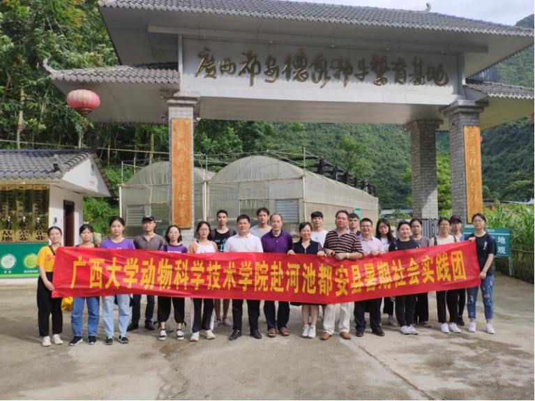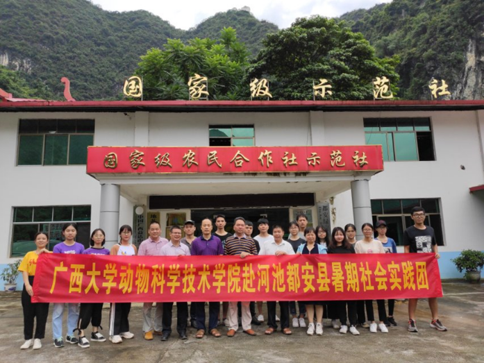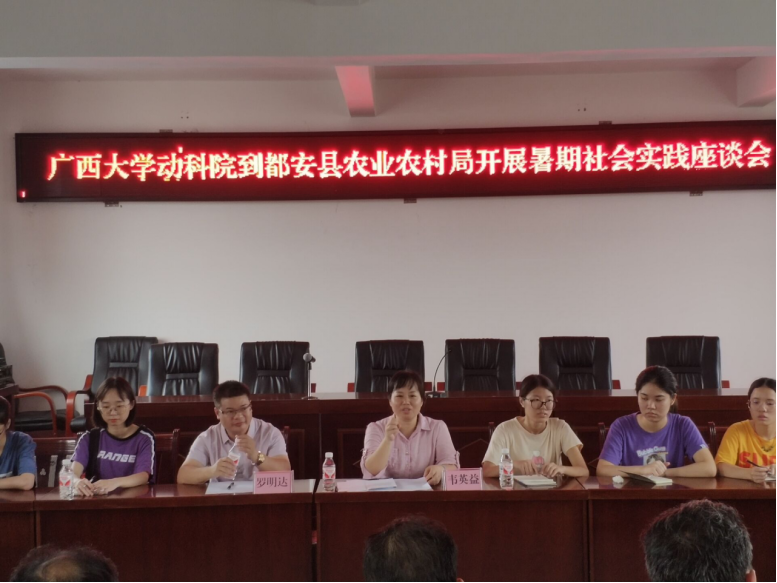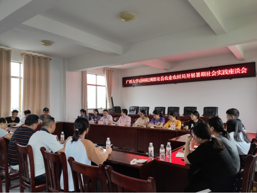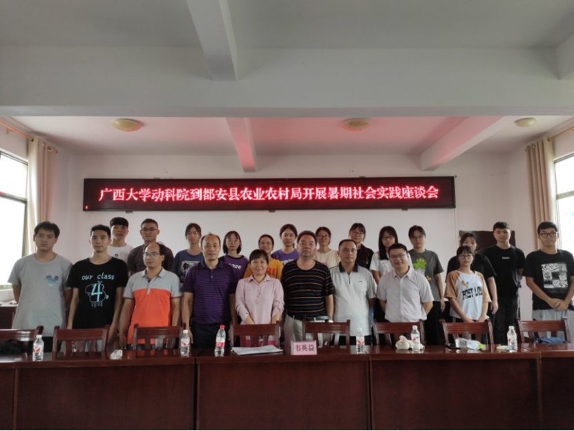 2019年7月19-20日,由韦英益同志指导带领的williamhill赴河池市都安县暑期社会实践团成员共18位动医2017级同学到都安县开展暑期社会实践活动。19日社会实践团全体成员与都安县水产畜牧兽医局的领导和技术员开展了关于“都安县畜牧业养殖现状及贷牛(羊)还牛(羊)特色扶贫模式”为主题的座谈会,韦海峰副局长、县防控中心陆高天主任和王兰芳副主任、县动监所韦生力副所长、牛羊产业中心石清柏主任以及兽医站站长、广西黑猪养殖学会罗明达会长等参加本次座谈会。