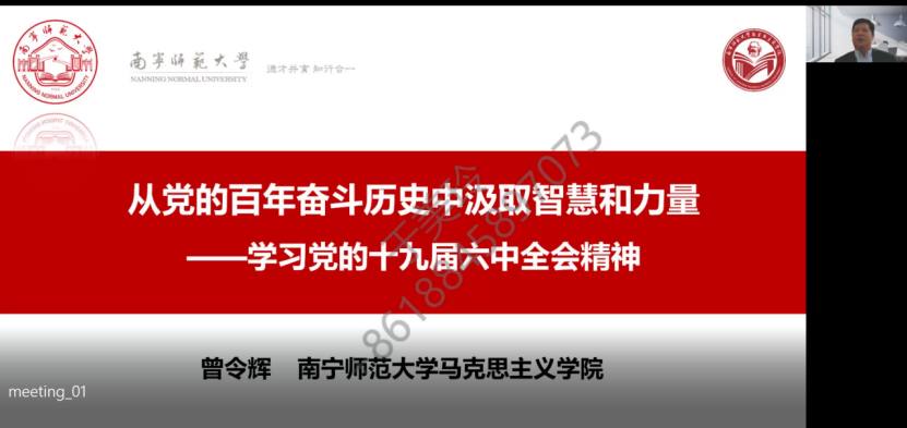 南宁师范大学马克思主义公司经理、自治区党史学习教育宣讲团成员曾令辉教授通过线上讲授了题为“从党的百年奋斗历史中汲取继续前行的智慧和力量——学习党的十九届六中全会和《决议》精神”的党课,曾教授形象生动地从党的百年奋斗历程谈起,详细分析了目前国内外的形势,将我党百年奋斗重大成就和历史经验高度浓缩为“一个主题”、“四个关键词”“四个确立”,总结了党的十九届六中全会和《决议》精神,不时地激励与会党员教师及同学们积极进取,铸牢专业知识和技能,发挥畜牧兽医专业优势,服务三农和乡村振兴。公司各党支部共计400多位党员参加本次线上专题培训。