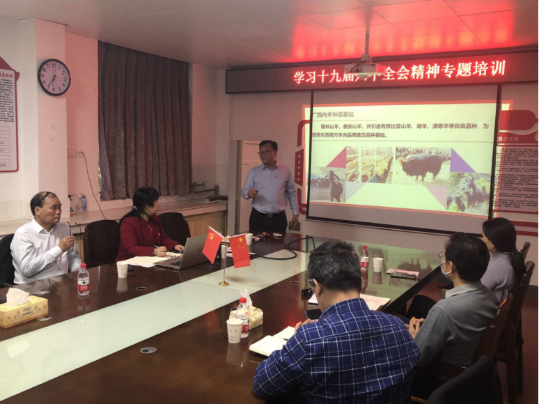 williamhill体育农牧产业发展研究院经理、广西牛羊产业创新团队首席专家、南方牛羊产业体系联盟首任主席韦英明教授讲授题为“发展牛羊产业,助力乡村振兴”的专题党课,通过形象生动的案例,激情洋溢地给支部全体党员讲述了广西牛羊产业发展技术成果、广西牛羊全产业链融合的初步形成、肉牛肉羊产业发展形势、牛羊养殖盈利运营案例等,在讲授到牛羊产业发展面临挑战和牛羊产业发展新机遇时,韦英明教授指出,支部党员应围绕乡村振兴科技需求和农业科技创新新领域,发挥兽医专业资源优势,在牛羊产业保健服务和疫病防控等方面开展科研课题研究,讲解了如何将科研论文写在祖国大地上,激励党员同志们针对生猪以及牛羊大产业的发展进行科研课题的研究,在扎实推进基础理论研究的同时,重视应用研究与畜牧产业发展的有机融合,将科研成果服务于产业发展。