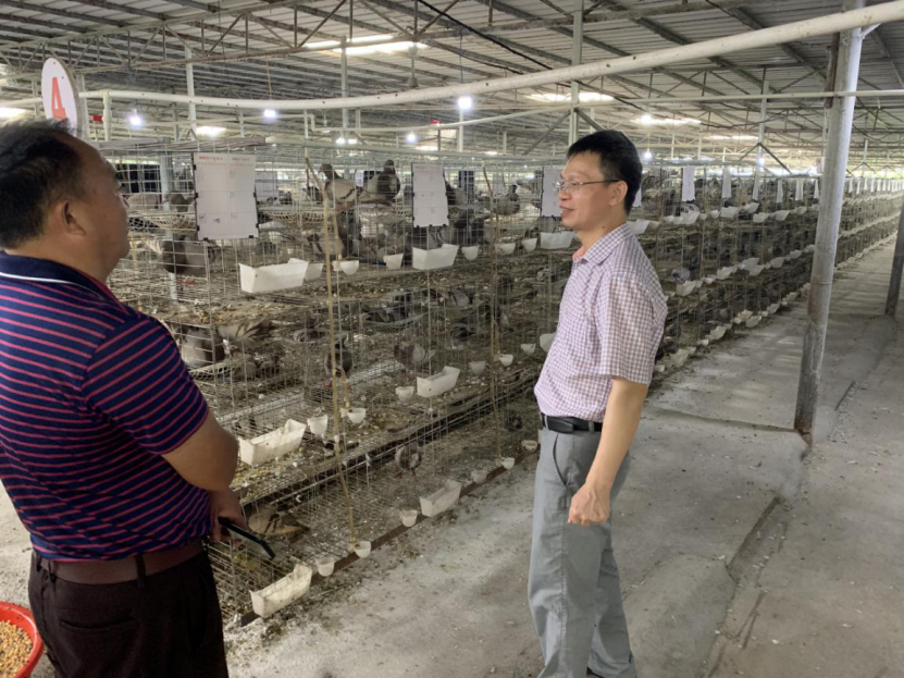 上图为韦天超副教授到百色市隆林县广西隆林鸿安种养有限公司肉鸽养殖扶贫基地进行技术指导和交流
