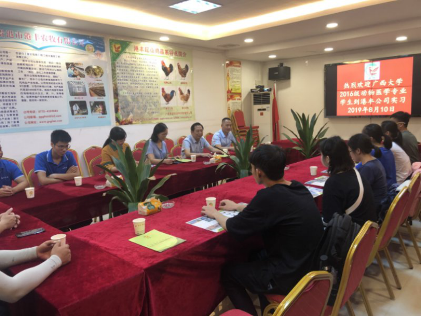 2019年8月10日,支部党员韦英益和磨美兰同志带队2016级动医专业本科生到贵港港丰公司进行生产实习和技术指导,与港丰公司领导和养殖场主要负责人进行座谈,了解养殖场的养殖情况;磨美兰同志就鸡病传染性支气管炎的具体防控提出相关的建议和意见,并进行临床样品采集,协助公司进行诊断。