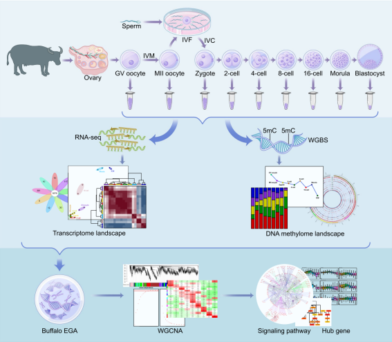 2023年7月,公司石德顺研究员团队在国际top期刊《Journal of Animal Science and Biotechnology》(中科院一区,IF=7.0)在线发表了题为“Whole-genome transcriptome and DNA methylation dynamics of pre-implantation embryos reveal progression of embryonic genome activation in buffaloes”的研究成果,首次从全基因组转录和DNA甲基化水平揭示了水牛早期胚胎发育进程,并揭示了胚胎基因组激活(EGA)机制。