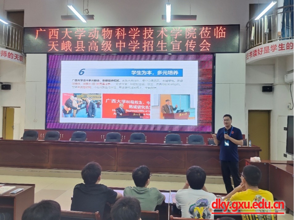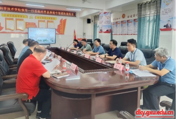为切实提升williamhill体育本科生生源质量,吸引更多优秀学子到公司深造,6月27日-28日,williamhill党委书记韦小强、经理陆阳清、副经理蒋钦杨、动物科学系主任李辉、动物医学系副主任于美玲、教学秘书覃志彪、专任教师韦英益、辅导员马朝阳一行8人先后前往河池市都安瑶族自治县高级中学、南丹县高级中学和天峨县高级中学开展本科生招生宣讲工作。